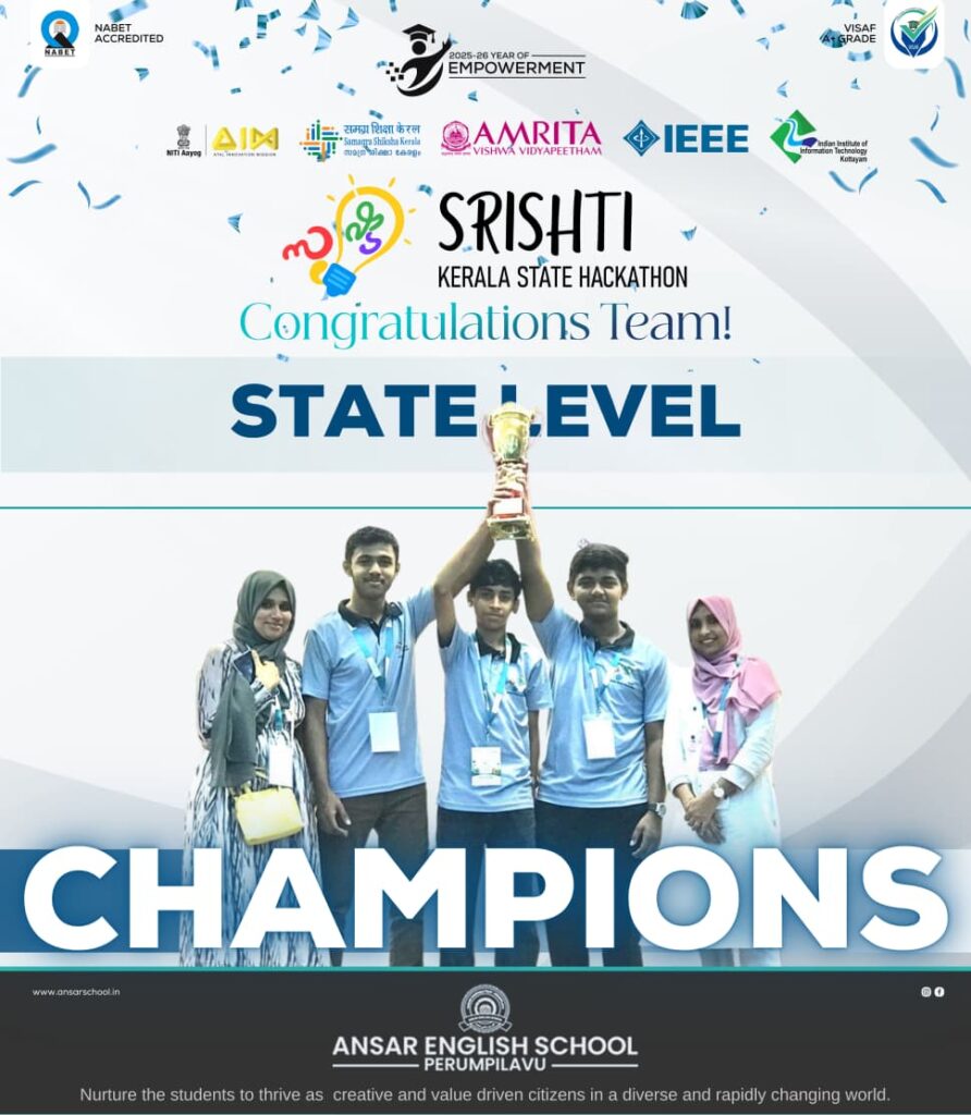 Ansar team of 3 students: Naamir Nishad from 12th, Shamil K A from 10th, Muhammed Shezan from 10th along with ATL Coordinators: Sukaina Abubakar, Najma K participated and won the State level Champions title 🏆 in the Srishti Kerala State Hackathon – MAKEATHON Finals, held today, on 21st September 2025 at Amrita Vishwa Vidyapeetham, Kochi Campus. This prestigious hackathon is jointly organized by Amrita Vishwa Vidyapeetham, in collaboration with IEEE Kerala Section and ATAL Innovation Mission (AIM), NITI Aayog.